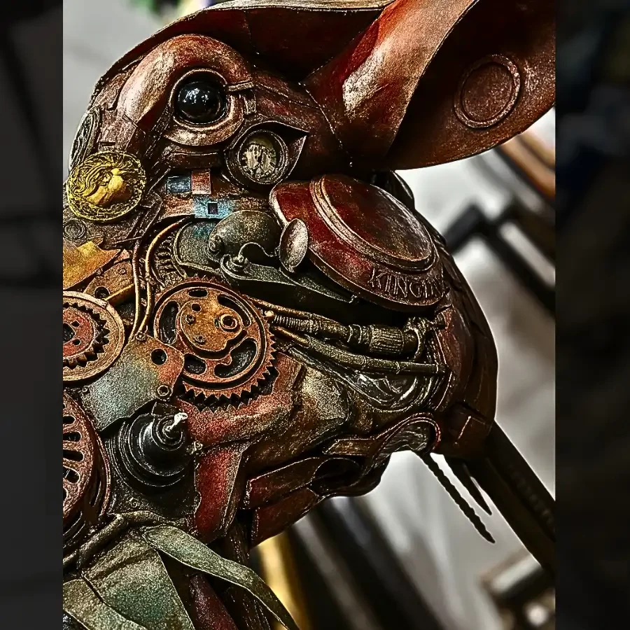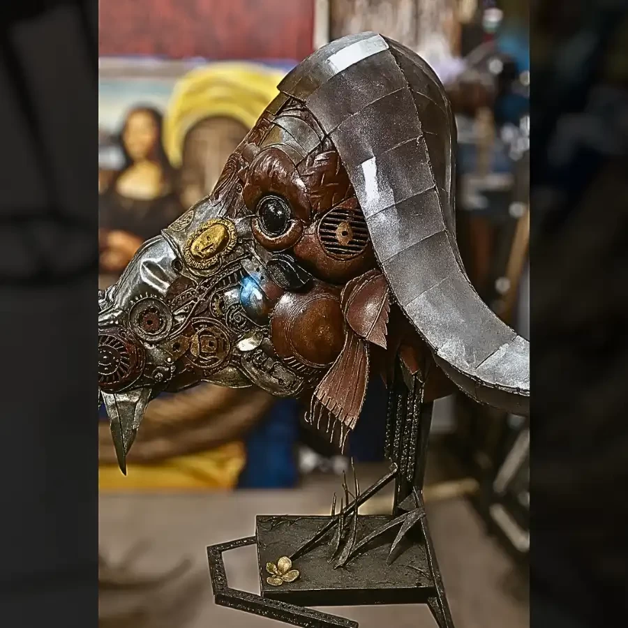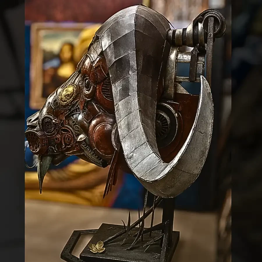 Adorned with sweeping horns and a symbolic nose ring, the sculpture carries both primal strength and modern sophistication. Red-brown metallic plating enriches its presence, while intricate details of gears and polished steel highlight the artisans’ creativity and precision. The eyes, set with glimmers of color, bring life and intensity to this striking wall piece.