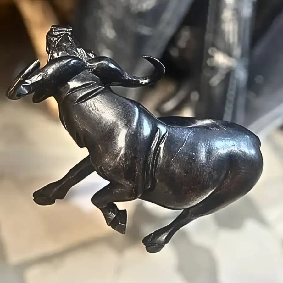 Buffalo-inspired sculpture in dynamic, mid-motion posture