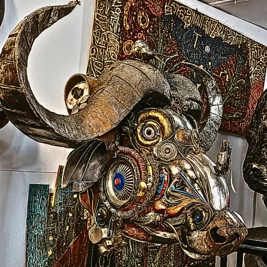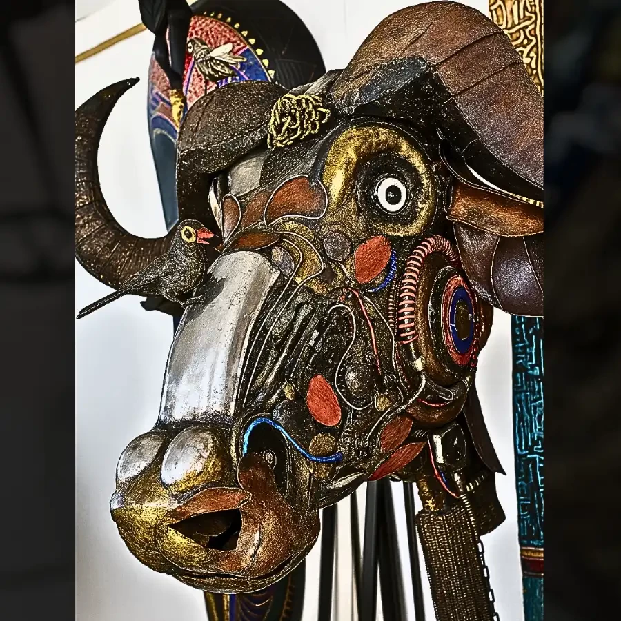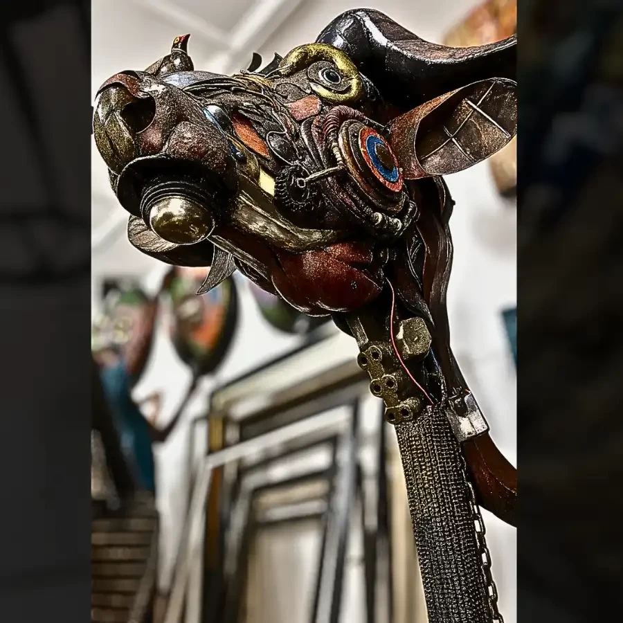 Artisans meticulously shaped machine parts, gears, and metallic fragments to create this bold piece, giving it both cultural depth and modern sophistication. The eyes are highlighted with vivid tones, while the horns sweep outward in a display of dominance and grandeur. The golden and silver accents add an element of luxury, making this sculpture a striking centerpiece for collectors, galleries, or heritage-inspired interiors.