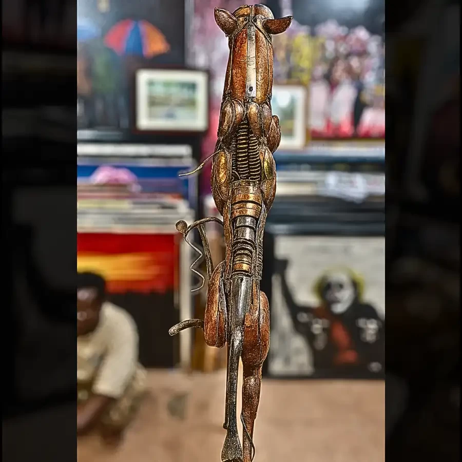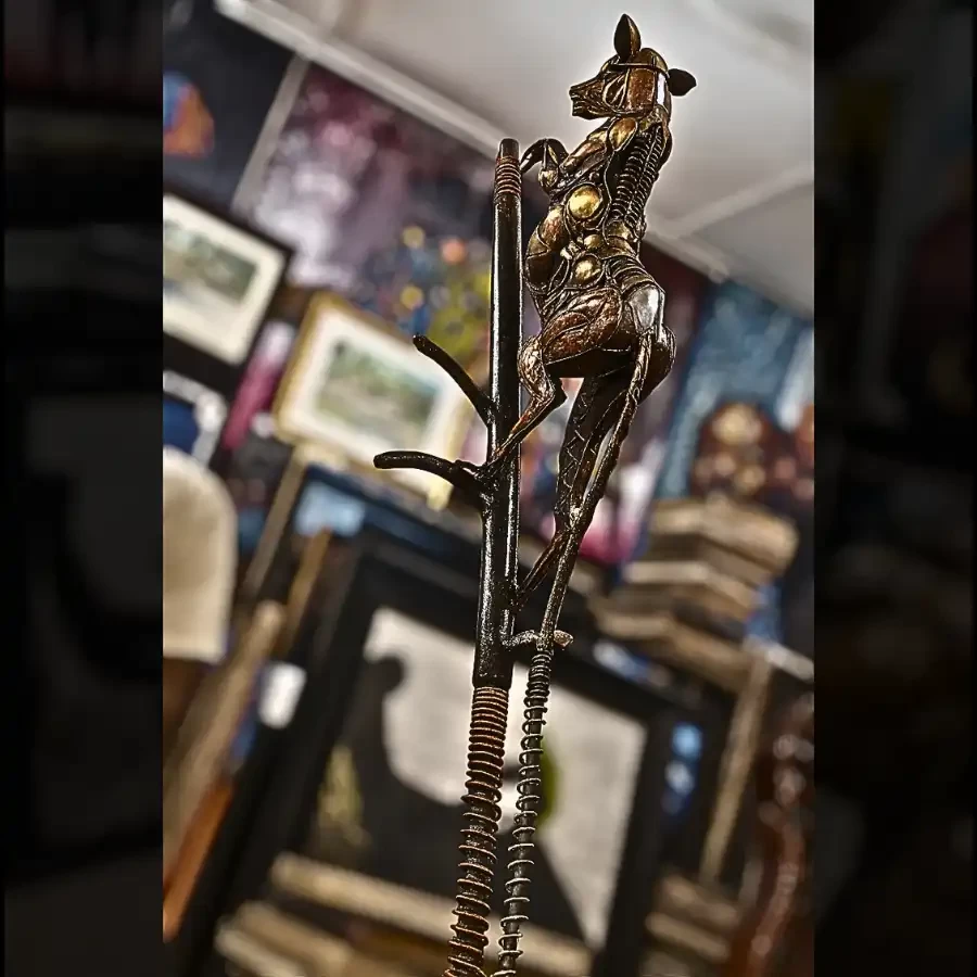 Handcrafted from recycled metals, gears, and alloys, the Leopard Ascendant embodies the artistry of transformation. Its bronze-toned surfaces gleam with life, while mechanical detailing, embedded accents, and layered metallic contours mirror the leopard’s raw musculature. Each angle reflects motion, resilience, and determination, reinterpreted through a futuristic design language.