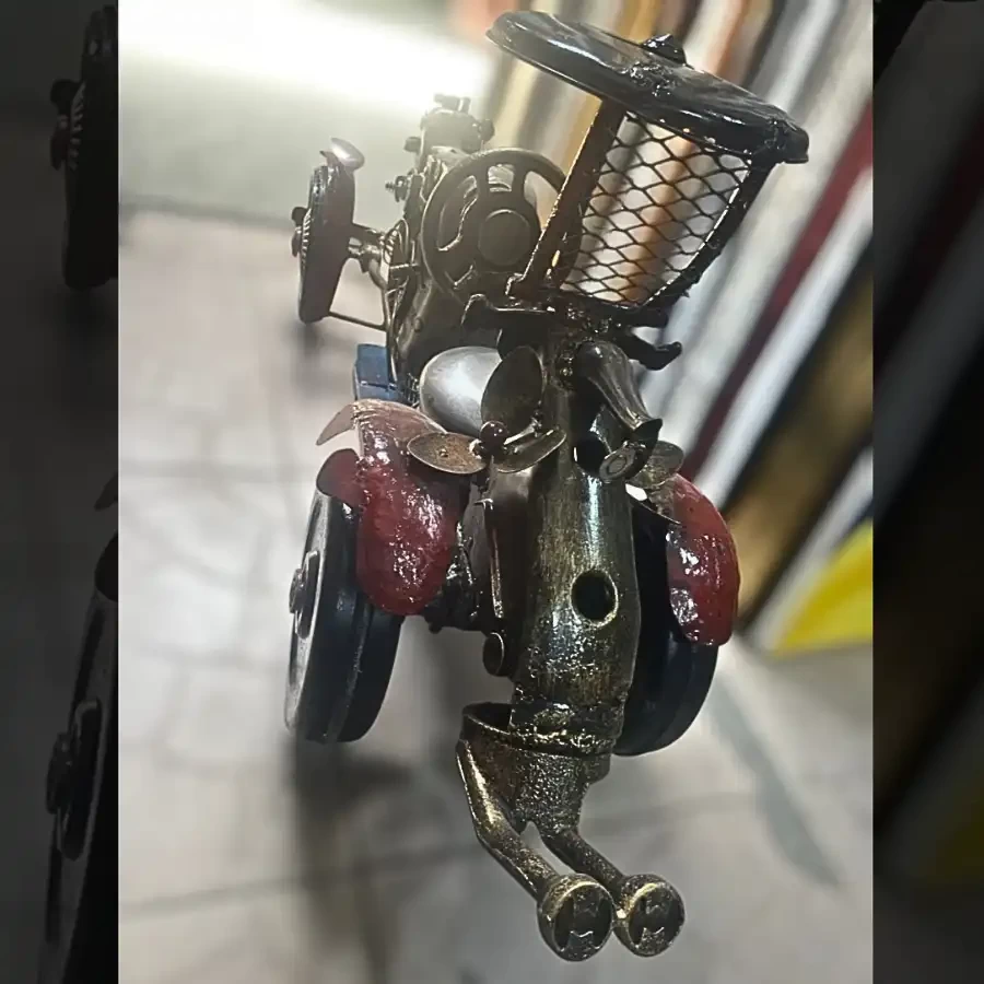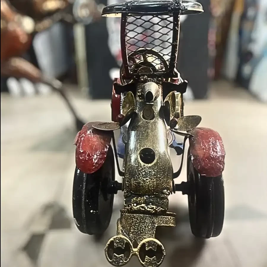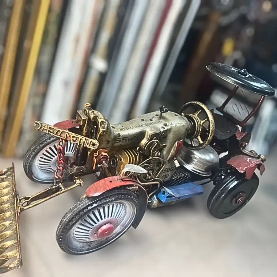 Every component carries a story: polished alloy wheels crafted from repurposed industrial hubs, a body sculpted from vintage machine parts, and accents of red, gold, and steel that breathe character into the design. At the front, a plow-inspired rake attachment captures the essence of labor and growth, while the rear structure hints at mechanical resilience and progress.