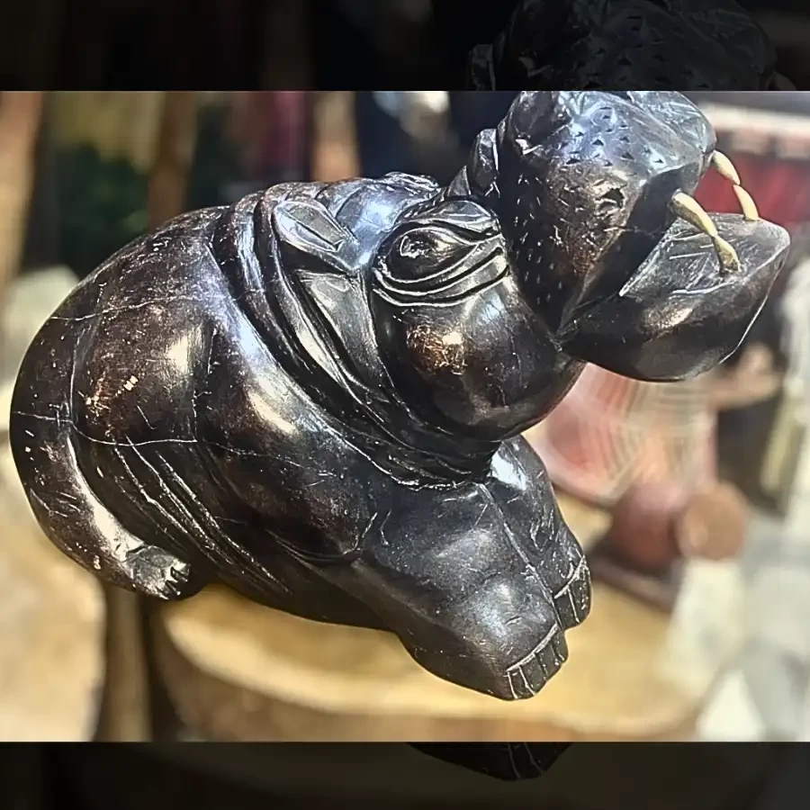 Handcarved wooden hippopotamus sculpture, polished dark finish